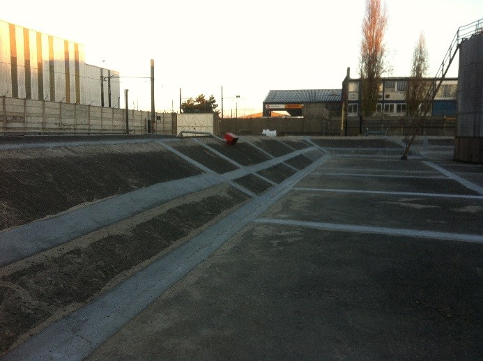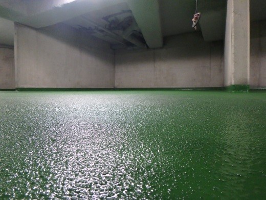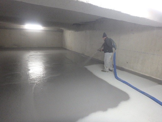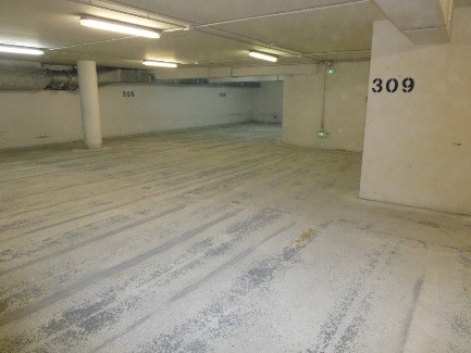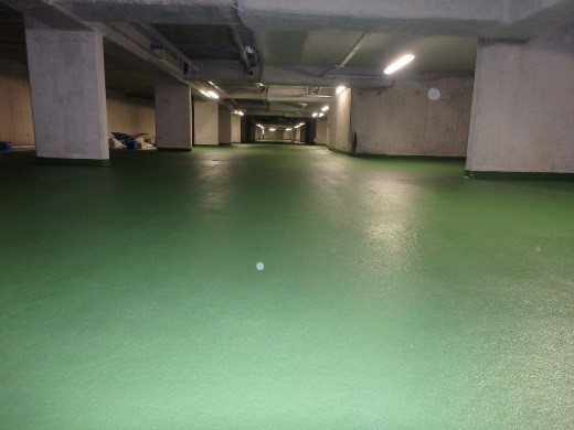 Dalle de parking dominant des locaux nobles (commerces) : Système d’étanchéité sous garantie décennale SINOTANE 2 des Ets RESIPOLY mis en œuvre sur les 4005 m² du parking couvert OPORTUNIA à Aulnay sous Bois. |