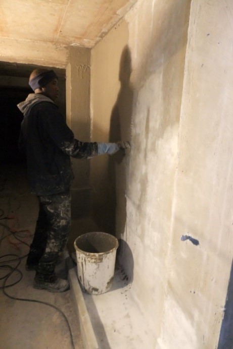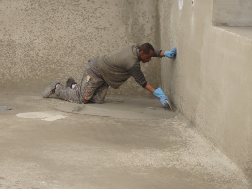 L’enduit mince d’imperméabilisation est ensuite appliqué sur l’ensemble de la paroi y compris à l’intérieur des cunettes |