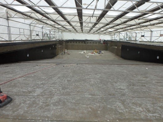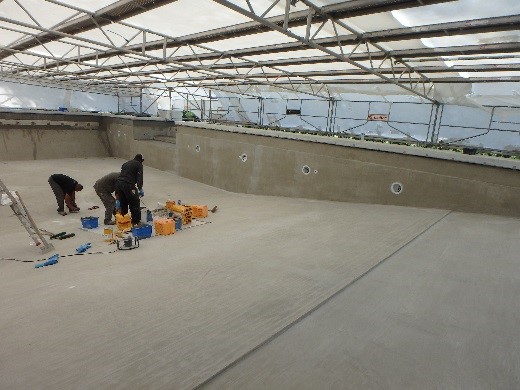 Des venues d’eau en contre pression nécessitaient un cuvelage par enduit mince sur l’ensemble du radier et des parois du bassin, avant la réalisation du revêtement stratifié. |