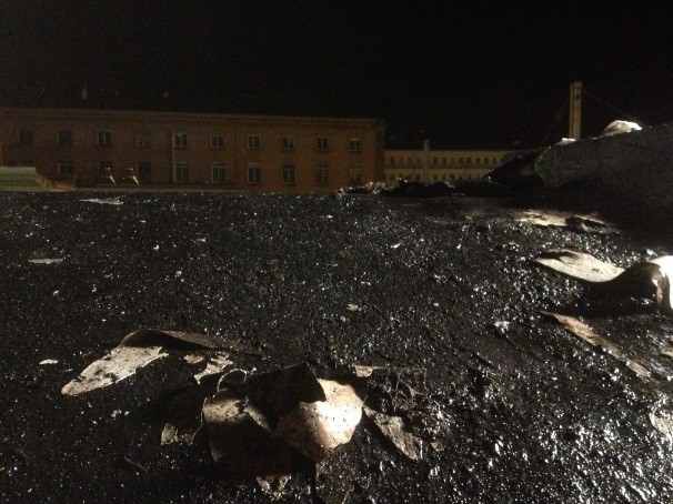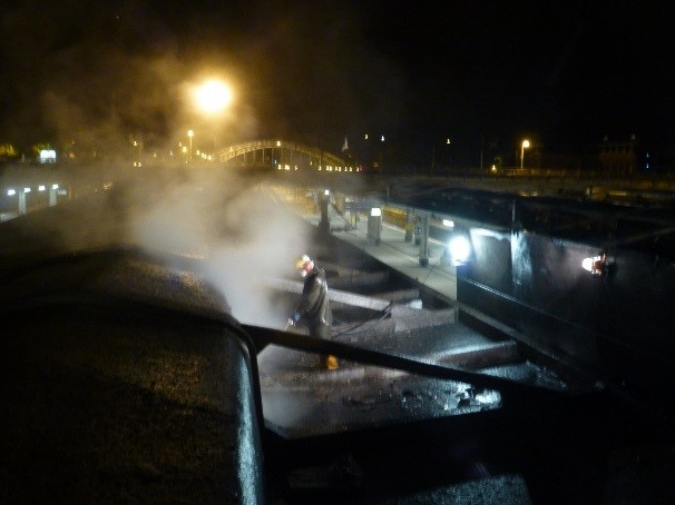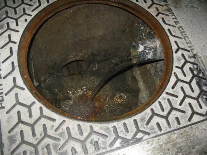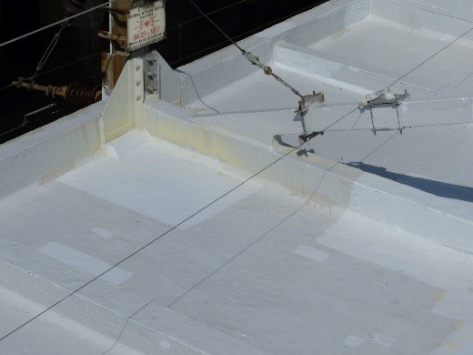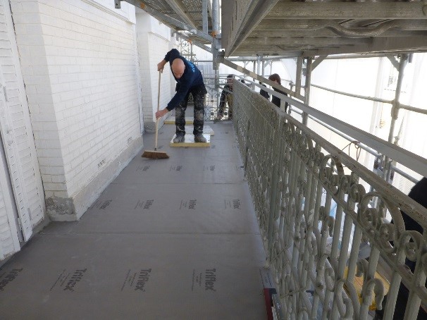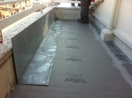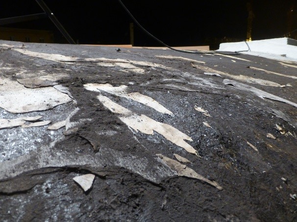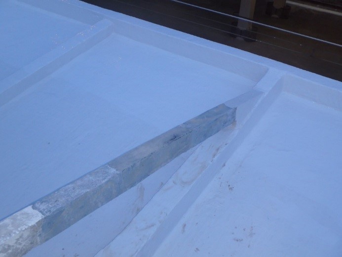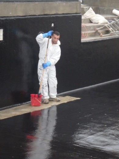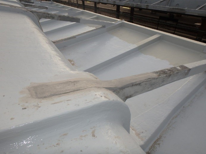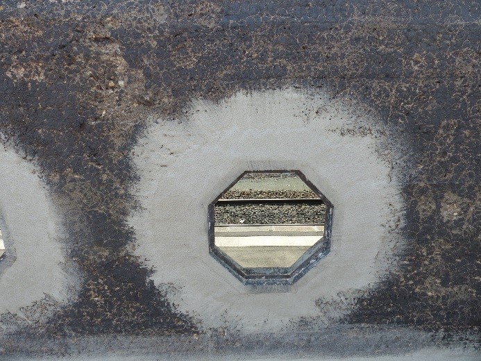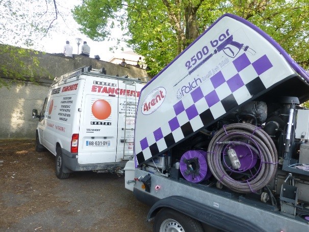 Après différents tests (500 bars, 1 000 bars, décapeuse pneumatique etc…), c’est le décapage par jet d’eau sous haute pression (2 500 bars eau chaude à buse rotative double jets) qui a permis de déposer l’étanchéité d’origine constituée de feutres particulièrement tenaces collés à bain de bitume. |