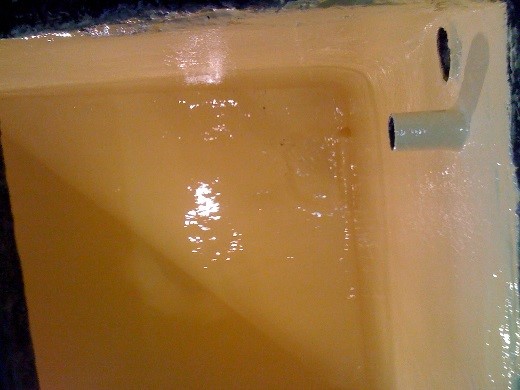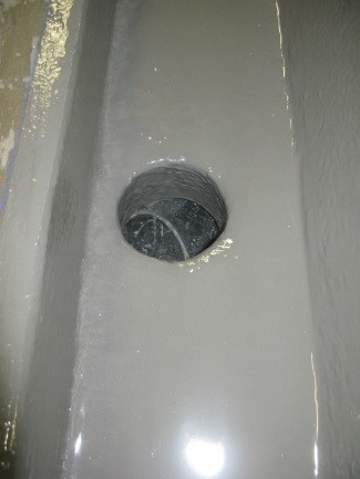 Le nouveau revêtement du bassin est composé de deux mats de verre de 300 gm² et d’un mat de surface type AM 30. Le premier lit est fixé mécaniquement au support par clous en acier inox et résine de scellement étanche. |