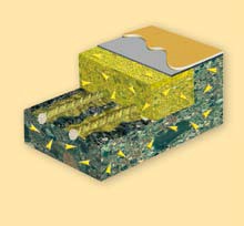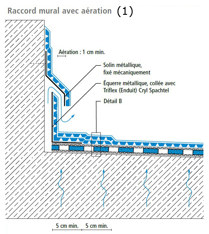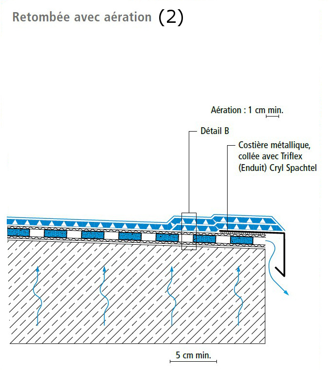 Système PRO DRAIN des Ets TRIFLEX France est spécialement dédié à la rénovation des supports imprégnés d’humidité. Ce système évite une démolition longue et coûteuse ainsi que la réalisation de nouveaux supports porteurs. Au niveau de la remontée (1) ou de la rive (2), les supports imprégnés d’humidité sont aérés par évaporation d’eau via les canaux d’aération placés sur la face inférieure du lé de drainage et par le biais d’un dispositif de forme spéciale. Le support ainsi préparé peut recevoir le revêtement d’étanchéité liquide à base de résine armée directement circulable ou une protection directement collée. Grâce à sa faible épaisseur, même les portes à seuils bas peuvent être raccordés sans problème. |