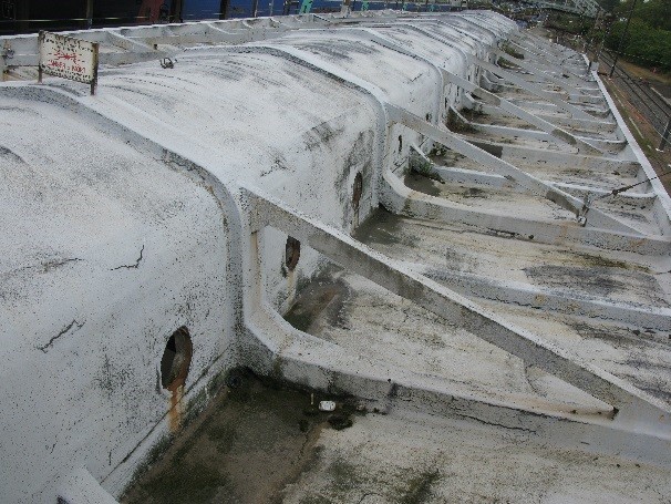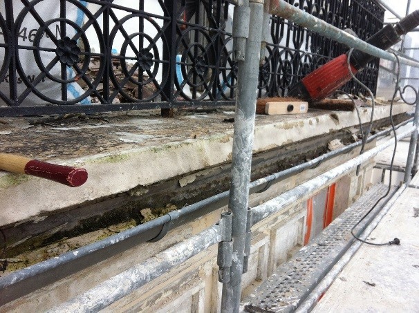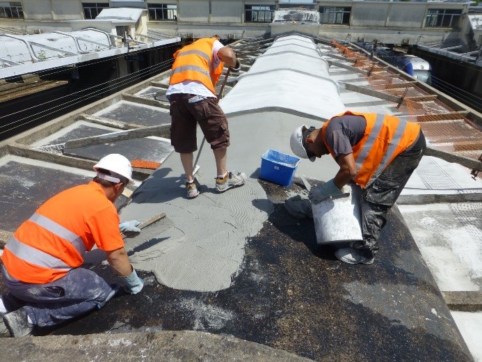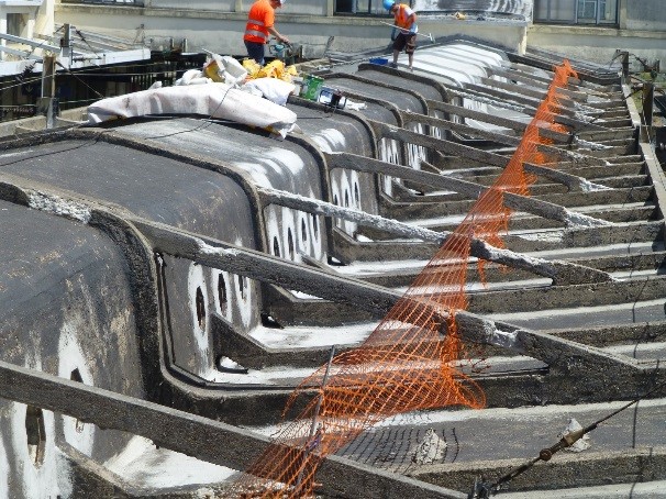 Afin de pérenniser l’ouvrage et pour se conformer aux Règles Professionnelles, SERTEC a proposé aux Maitrises d’œuvre et d’Ouvrage un décapage de l’ensemble des revêtements couvrant l’extrados des marquises construites en 1934. Ce décapage n’avait pas été exécuté lors de la phase 1. |