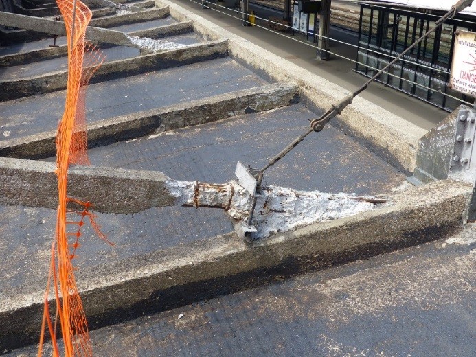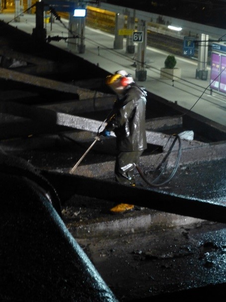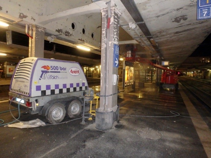 Nos travaux comportaient la réfection du revêtement d’étanchéité de l’extrados d’une surface de 3 530 m², la restructuration des bétons et la mise en peinture des 4300 m² de sous faces, intégrant également les travaux de serrurerie (remplacement des hublots), ainsi que la mise en place d’une ligne de vie et de filins délimitant la zone d’emprise de consignation caténaire. C’est sous consignation caténaire (23h00 – 5h00) que la majorité des prestations ont été exécutées. |