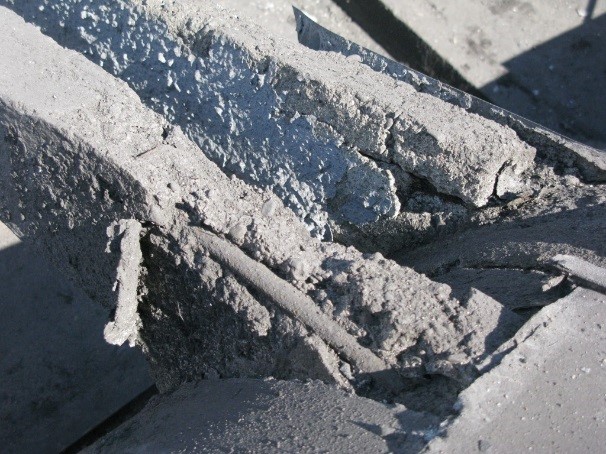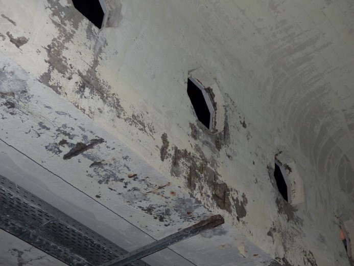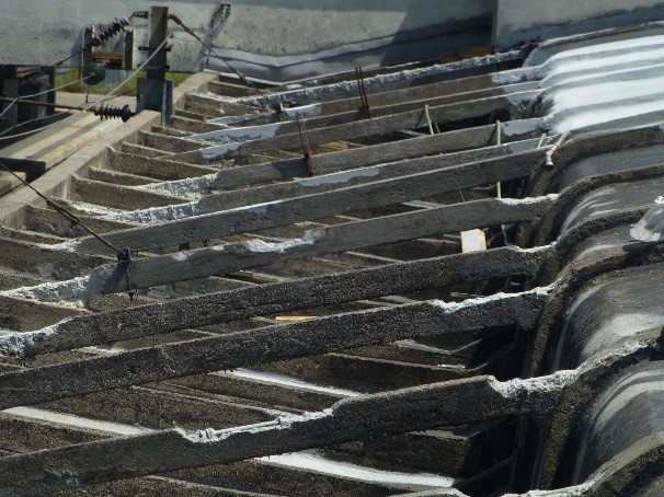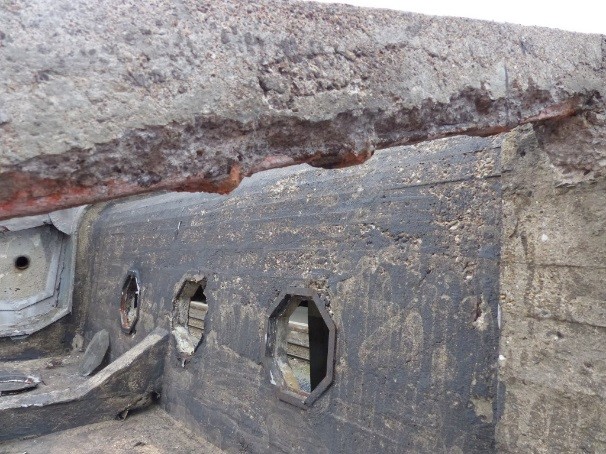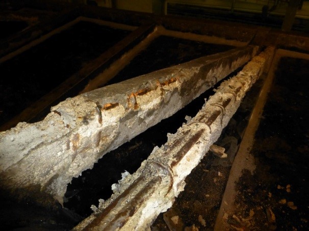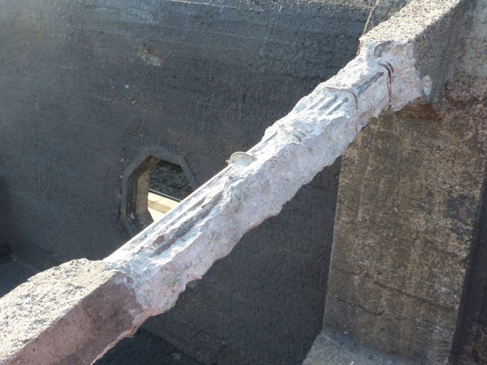 A l’issue de ces travaux de décapage, des désordres importants sont apparus, principalement au droit des tirants et nervures. Les nombreux détachements et éclatements du béton laissent apparaitre des armatures fortement corrodées, présentant d’ importantes pertes de section. |