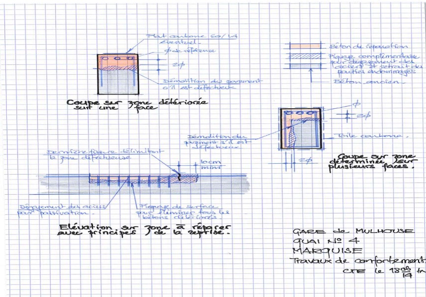 Les renforcements par lamelles et tissus en carbone sont positionnés suivant les indications du Bureau d’Etudes Structures dans le respect du Dossier d’Assurance Qualité élaboré pour ce projet. |