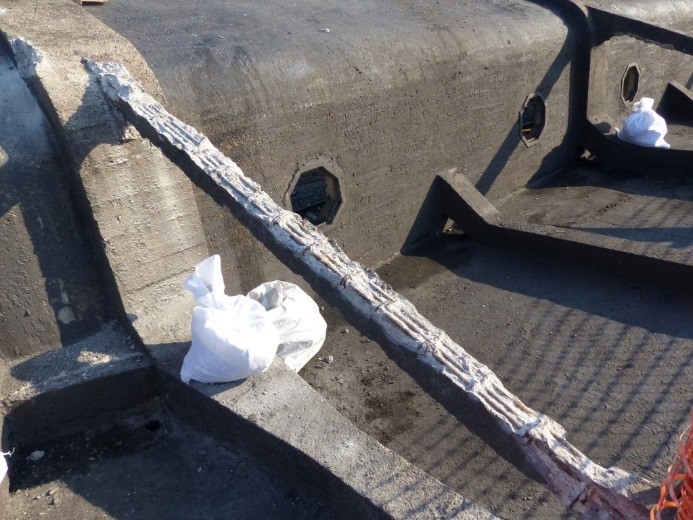 En sous-face, après nettoyage haute pression (500 bars), les bétons dégradés sont purgés et restructurés à l’aide de mortier de réparation fibré de Classe R4. |