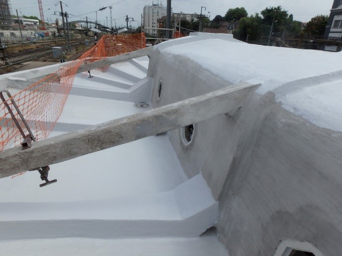 Les descentes sont remplacées par des ouvrages en zinc et les 4 300 m² de surfaces en béton sont recouvertes de 3 couches de peinture acrylique satinée. |