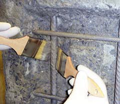 Avant renforcement, l’ensemble des parties dégradées, soit plus de 70 tirants, sont soigneusement purgés. Les aciers apparents sont brossés et passivés, puis les bétons sont restructurés à l’aide de mortier de réparation fibré, prédosé et modifié aux polymères, de classe R4. |