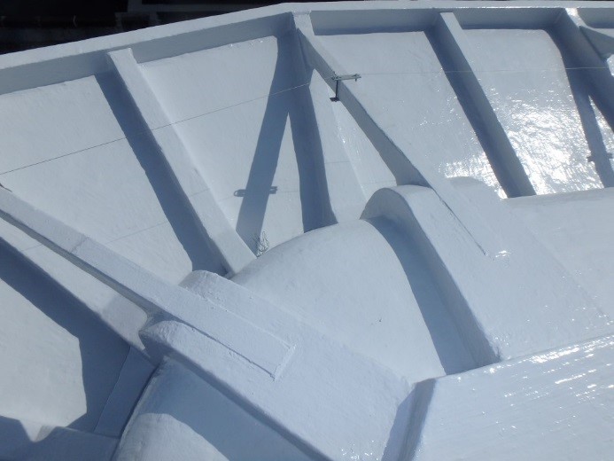Après léger ponçage à l’abrasif, une couche de résine polyester pigmentée et paraphinée (gel coat) est appliquée en finition. |