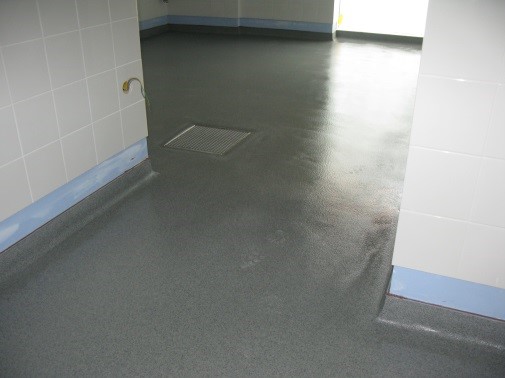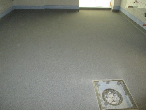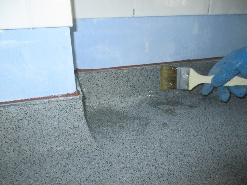 Principe de rénovation d’un sol de parking : après grenaillage, réalisation d’une couche de liant à base de résine époxydique chargée de silice (tiré à zéro), sablée à refus. Après polymérisation, écrétage et aspiration, suivi d’une couche de résine époxydique teintée. |